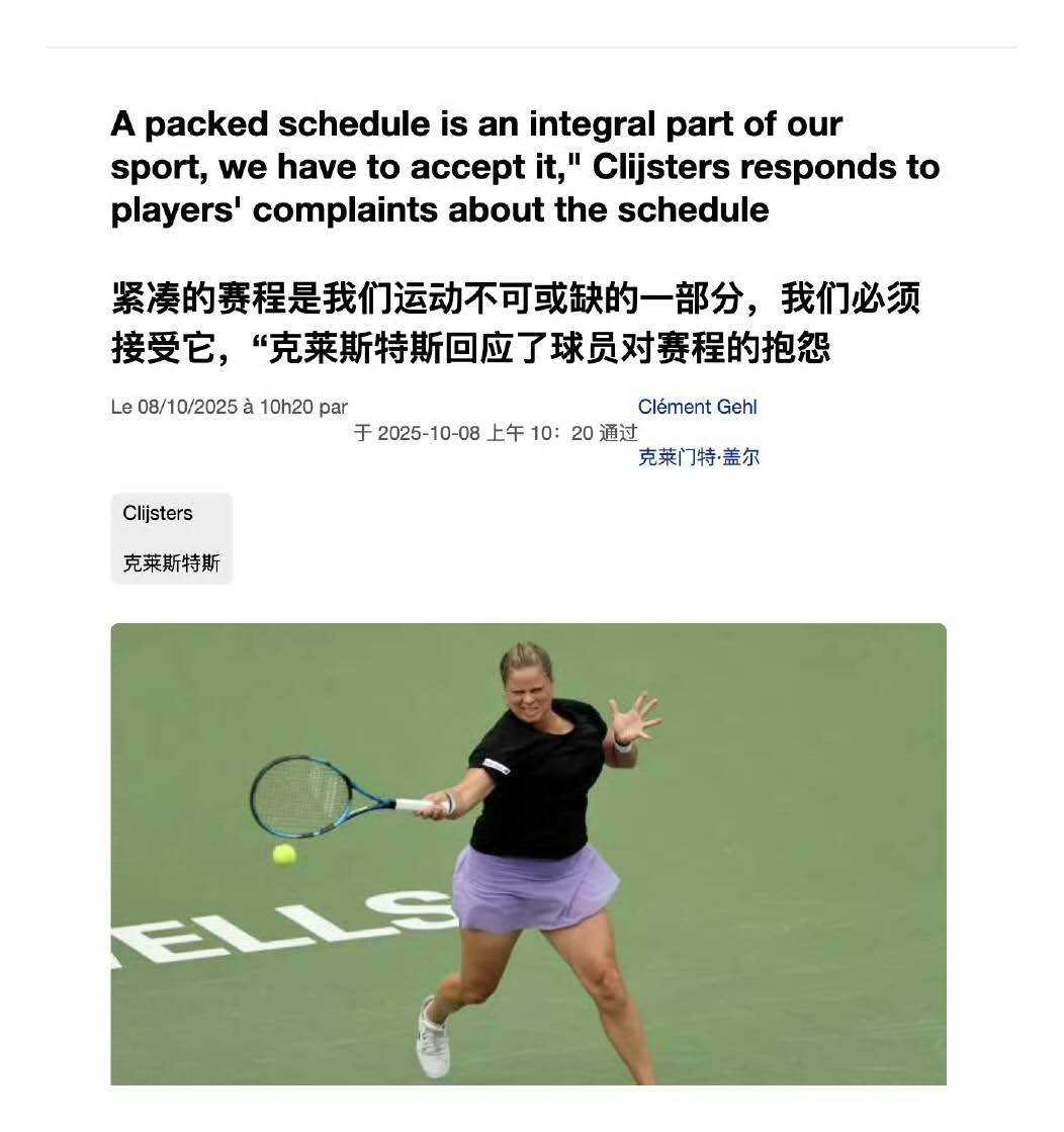 网坛愈演愈烈的赛程过长争议引发球员不满,斯瓦泰克、阿尔卡拉斯、高芙、萨巴伦卡纷纷发声指责现在的赛程安排非常不合理。然而,对此,前世界第一克里斯特尔斯直言不讳地指出,以她曾经在球员工会的经验来说,密集赛程的根本原因是因为很多赛事必须要存在,而这也是为了照顾很多低排名球员的参赛需求,因为要保证全年都有比赛进行,且任何赛程不可能让所有人满意。