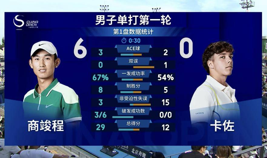 本场双方迎来生涯第2次交锋,首盘比赛商竣程状态极为火热,轻松压制卡佐连赢六局比赛送蛋,其中三度完成强势破发,并在首局与第六局均是直落四分拿下,从而以6-0赢下首盘比赛。