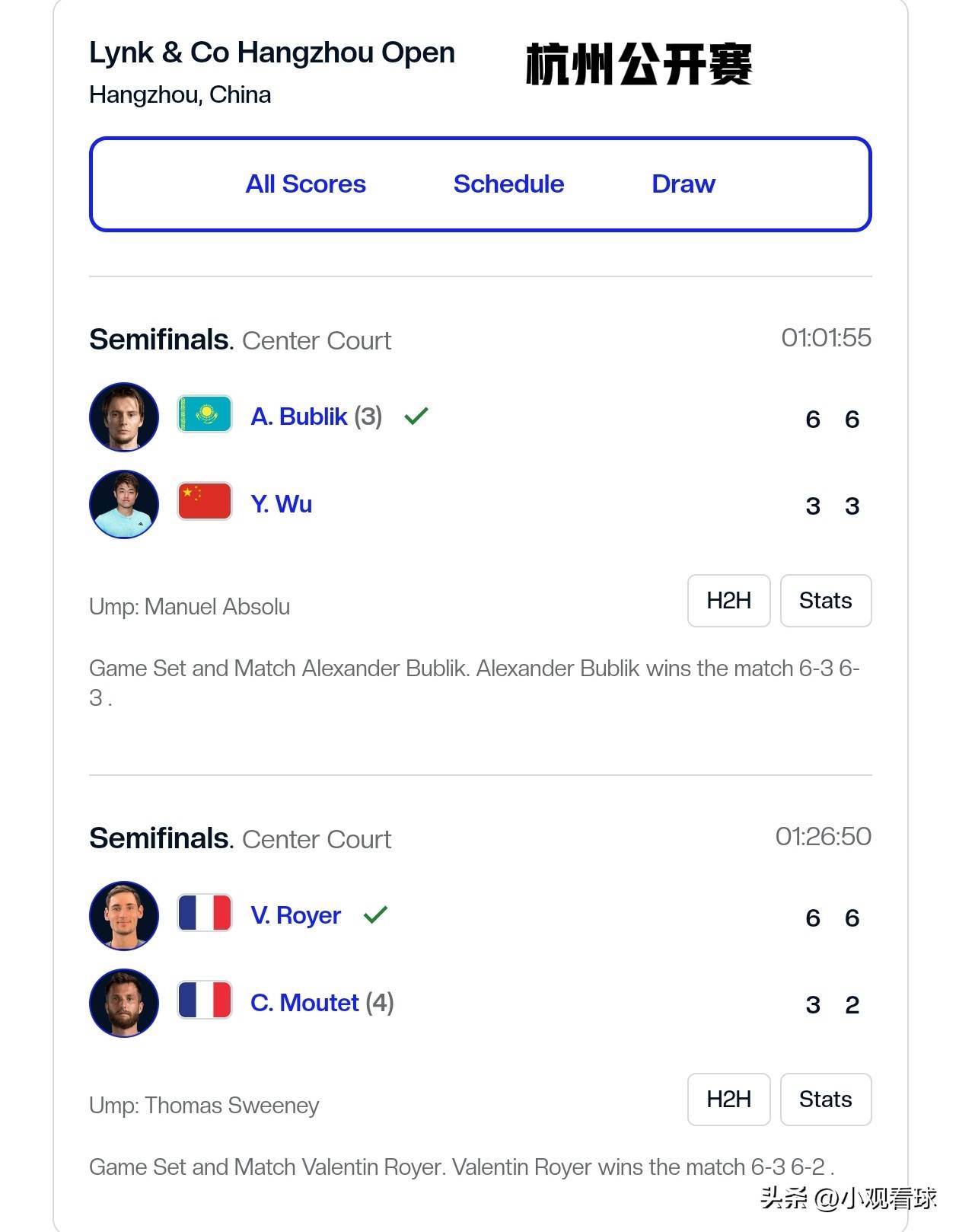 杭州公开赛,决赛在3号种子布勃利克与资格赛选手罗伊尔之间进行。排名88位的罗伊尔从资格赛打起,连赢6场了。他在第二轮淘汰了1号种子卢布列夫,1/4决赛战胜7号种子勒纳钱,半决赛战胜4号种子穆泰。一路从资格赛闯进决赛。而排名19位的布勃利克,本赛季已经赢了3个巡回赛冠军,包括在哈雷公开赛第二轮淘汰辛纳,并非常终夺冠。