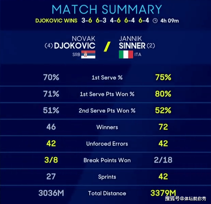 这场比赛,38岁的德约科维奇与25岁的辛纳,打了4小时09分钟,赛后跪地庆祝的一幕,也是让很多老球迷流下了激动的泪水,这一刻实在是太不容易了,德约时隔3年再进大满贯的决赛。