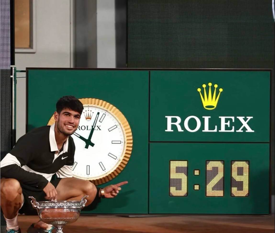 法网历史上用时最长决赛的冠军。2025年法网,阿尔卡拉斯和辛纳联袂上演了一场5小时29分钟的法网历史上用时最长的决赛。阿尔卡拉斯第四盘第九局挽救了辛纳三个连续的破发点兼冠军点,并在随后的第十局破掉了辛纳的发球冠军局,最后鏖战五盘,逆转战胜了辛纳,卫冕法网冠军,这是阿尔卡拉斯职业生涯第五个大满贯冠军。阿尔卡拉斯就此成为公开赛年代继瑞士球王费德勒之后第二位赢得职业生涯前五次大满贯决赛的选手,并且成为公开赛年代继瑞典冰山博格、西班牙战神纳达尔之后职业生涯夺取五个大满贯冠军第三年轻的选手。