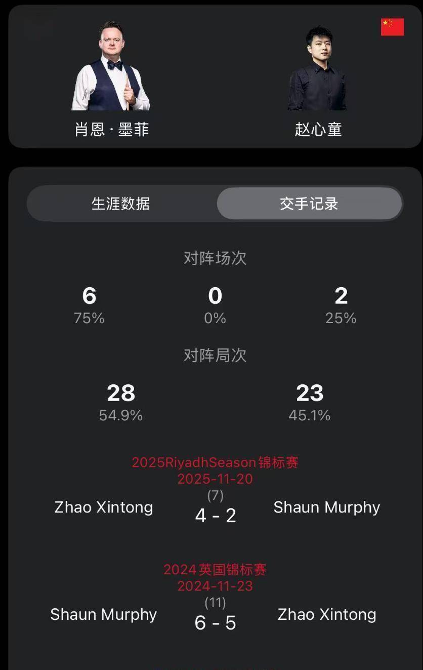 自从赵心童在2025年世锦赛夺冠后,他和墨菲只交手过一次。 在2024年英锦赛中,赵心童以外卡身份参赛,正赛首轮对阵墨菲,最终5-6惜败。 从这些交手记录来看,赵心童的实力已经和墨菲站在同一水平线上,胜负将主要取决于临场发挥。