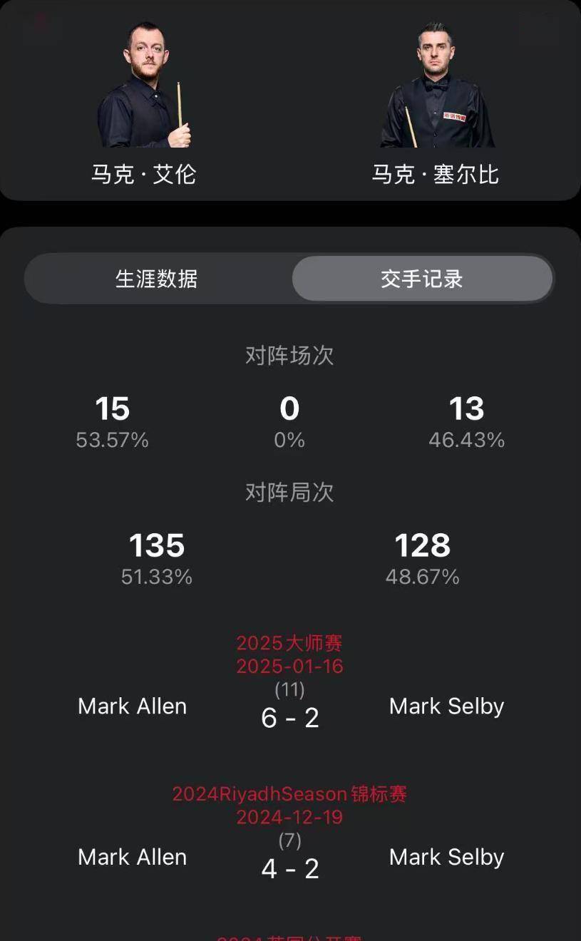 2月21日凌晨三点,最后一场四分之一决赛将在马克·艾伦和马克·塞尔比之间进行。 这两位80后选手历史上交手28次,艾伦15胜13负稍占上风。他们最近一次交手是在2025年大师赛,艾伦6-2获胜。