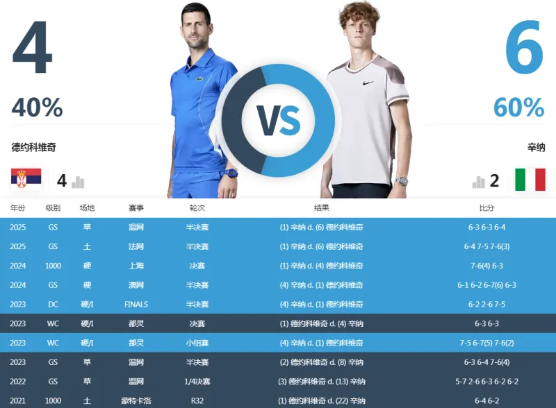 - 流言板]辛纳对德约科维奇交手记录6-4领先近5次交手全部获胜ATP巡回赛2025